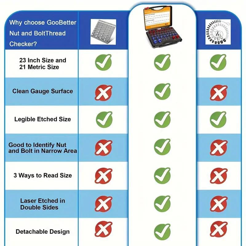 Upgraded Thread Checking Set: Every thread checker is inserted into well cut foam that holds them firmly in place to prevent them from bouncing around in the box, but not so tight that you can easily remove them. Easier to use than connected nut or thread checkers, because you no longer have to carry a whole bunch of gauges to measure individual screws or nuts and can reach any tight spot.
